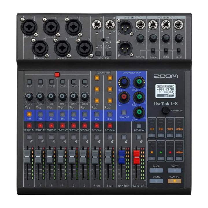 Muchos están de acuerdo en que LiveTrack L-8 es un gran compañero para cantautores y pequeñas bandas, ya que ofrece un sonido de alta calidad de los preamplificadores y procesadores integrados de Zoom. Sin embargo, LiveTrack L-8 no se limita a capturar actuaciones en vivo. También actúa como una grabadora de 12 pistas y una interfaz para el estudio de su hogar.