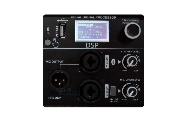Equipada con DSP integrado y 4 preajustes de ecualización (Normal, Pop, Jazz y Classic), permite ajustar fácilmente la respuesta sonora según el tipo de música o el entorno, garantizando siempre la mejor experiencia auditiva. Su respuesta de frecuencia de 40 Hz a 16 kHz (+/- 6 dB) asegura graves profundos, medios claros y agudos precisos, mientras que el woofer de 12 pulgadas y el driver de 1,75″ de ferrita reproducen cada detalle con fidelidad profesional.