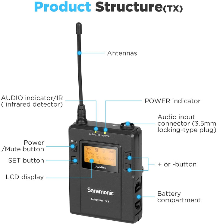 - El Saramonic UWMiC9 es un sistema de micrófono inalámbrico que proporciona audio fiable y de calidad de emisión adecuado para una variedad de aplicaciones como ENG/EFP, entrevistas, presentaciones, cobertura de eventos y videografía.