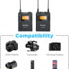 - El sistema digital ofrece 96 canales en el rango de frecuencia UHF para un audio estable y sin interferencias y permite el uso de dos transmisores simultáneamente. Un rango de funcionamiento de más de 328.1 ft en áreas abiertas ofrece un montón de opciones de colocación de cámara.